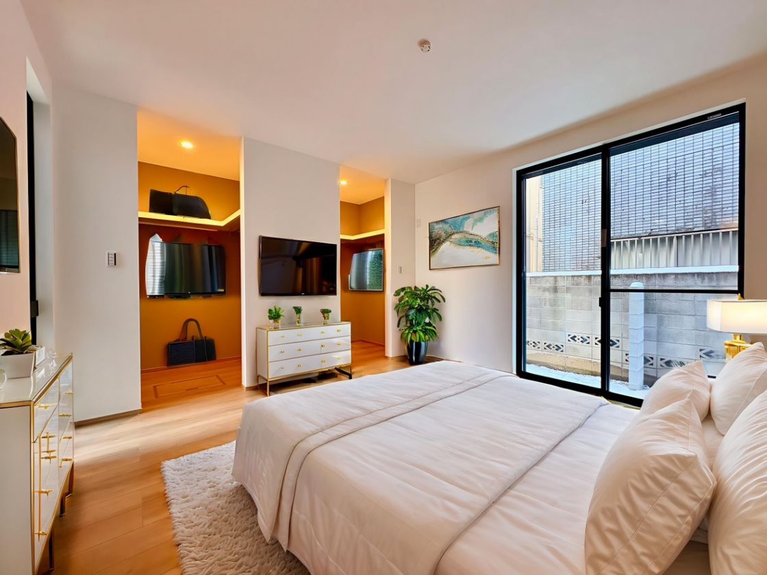 コンクリートウォールとモノトーンでシックに纏めた室内に赤の差し色が鮮やかに眩しい、デザインだけでなく寝室から2wayのパウダールームなどレイアウトの工夫も嬉しい。駅5分、吉祥寺の雑踏を眼下におさめた暮らし、毎日がワクワクです。