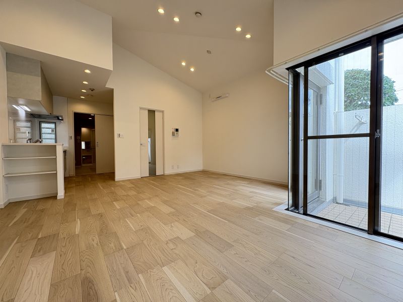 空気が違う。パティオのシンボルツリーを取り囲むように建築された低層タウン。白基調にアイボリー調のアクセントを取り入れ柔らかい風が通り抜ける街並みになっています。はじめて足を踏み入れたときは2回後ろを振り返りました。あれ、何処に来たのだろうか?緩やかなカーブを描きながらシンボルツリーまで伸びるタイル貼りのアプローチ、主張しすぎない、緑と空と一体化した建築物。見事な空間づくりです。今回、この街並みの1住戸をフルリノベーションしています。室内もホッとできる空間。廊下はメーターモジュール、天井は屋根勾配を活かした高天井。窓が多くあり、ガラス越しには敷地内に植樹された緑の風景。素敵です。