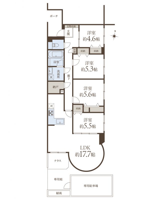 | 間取タイプ | 4LDK+N(納戸)+専用庭+専用駐車場 |