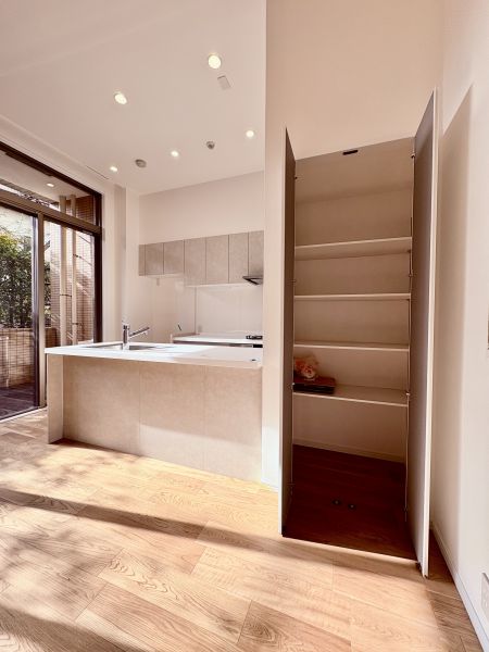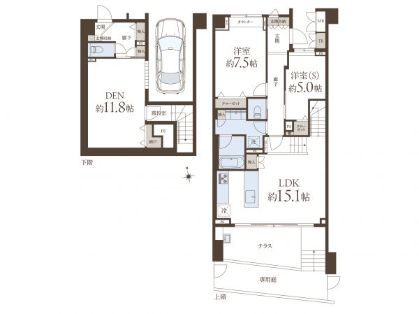 専用の地下駐車場横にもう一つのエントランスのあるレイアウト、室内は巧みにステップフロアで行き来が出来る造りで、ステージに降り立つようなリビングは、天井が高く南から暖かい日が差し込みます。表とは視線の合わないプライベートテラスもとても魅了的で、テーブルを出してゆっくり過ごすお時間が楽しめそうです。車のすぐ横にお部屋のある便利な暮らしは、小さなお子様、たくさんのお買い物、ペットとのお出かけなど多くのライフスタイルに充実感をお感じいただけます。