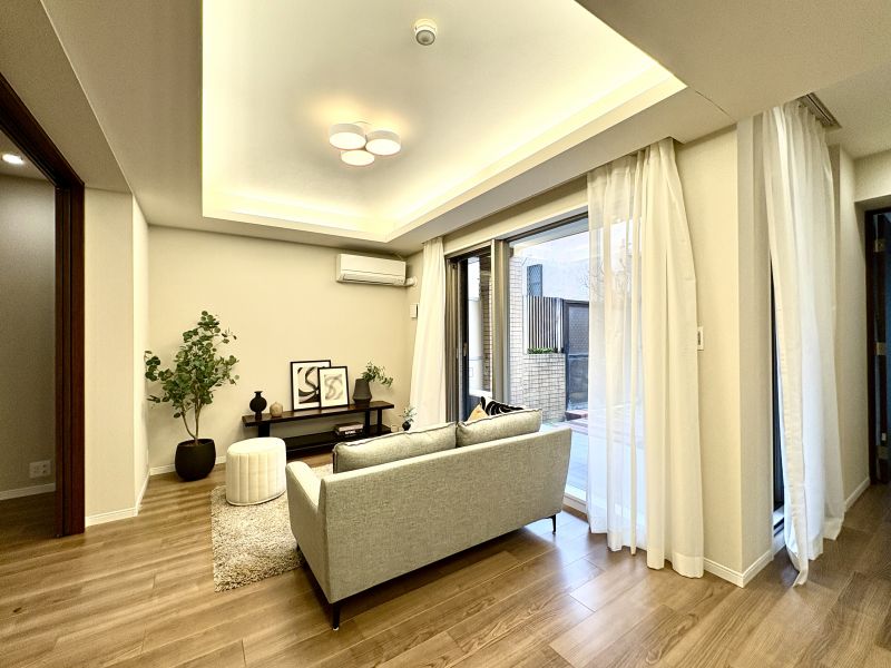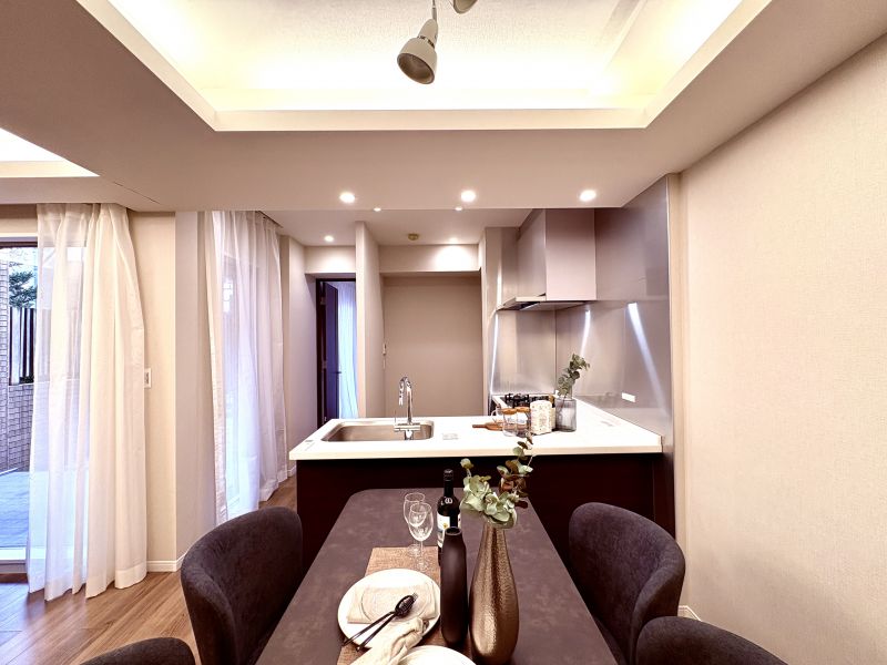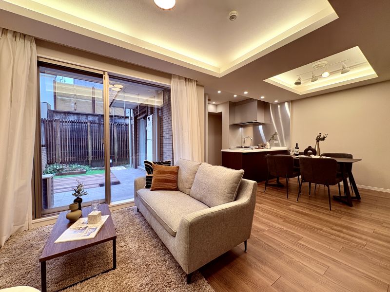 周囲は低層の住居専用地域、2階建ての戸建て住宅が建ち並ぶ邸宅街に建つ専用庭付きの4LDKです。高い建物の無い南の空から庭先に注ぐ日差しが嬉しいリビングダイニング。休日にのんびり微睡む至福の時間が癒やしを与えてくれる暮らし、時間もゆっくり過ぎていくようです。