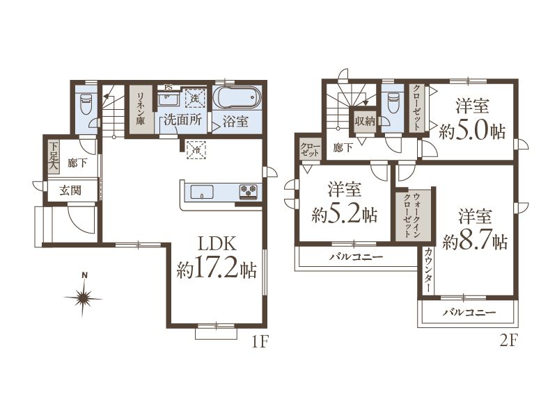 5.4mの公道に面した整形の角地、南西側にカースペースを配し陽光が差し込むように設計された1階のリビング、4人家族の暮らしを支える各室収納の3LDKはキッチンサイドの水回りに加えてリネン庫のあるプランです。生活動線の確保、リビングイン階段など子育て世帯には家族の顔がしっかり見える安心な家です。