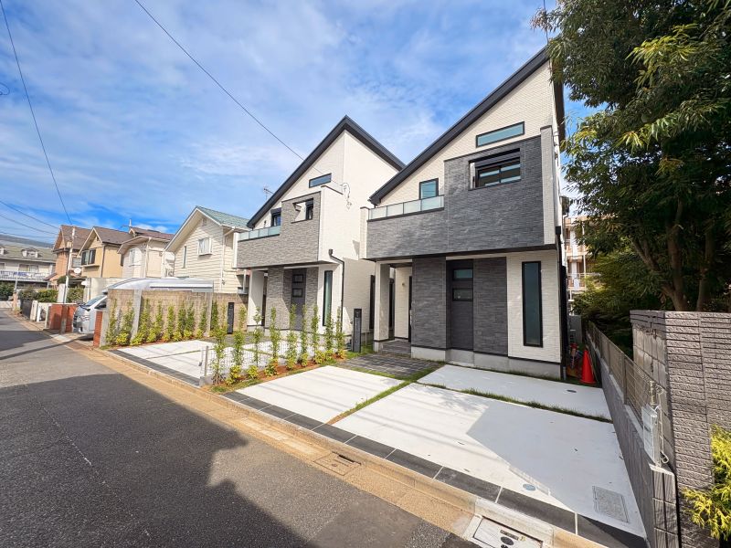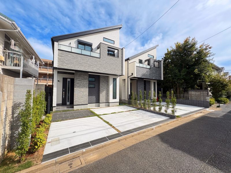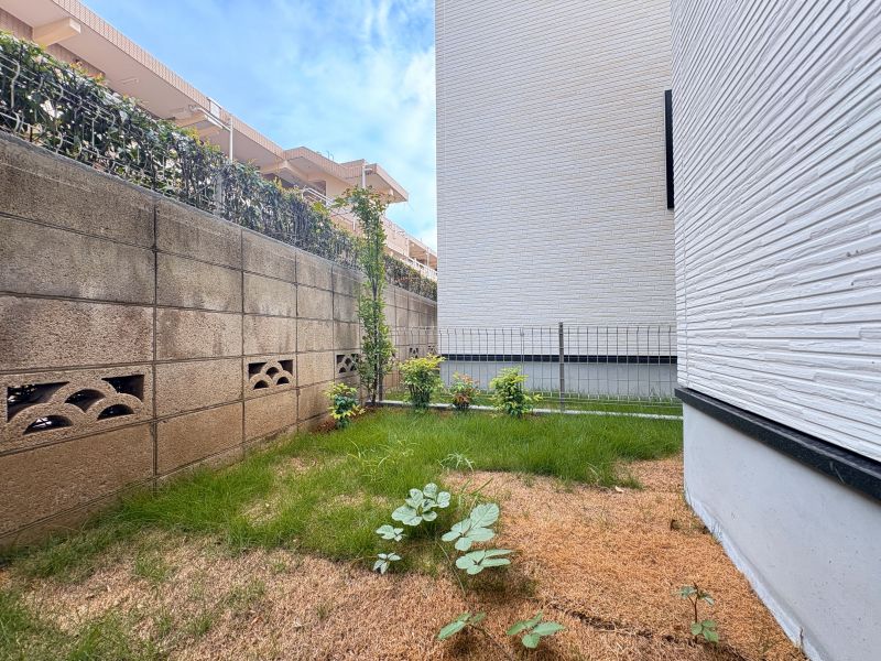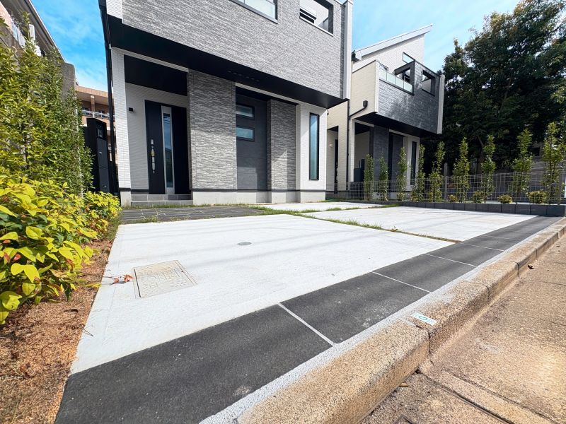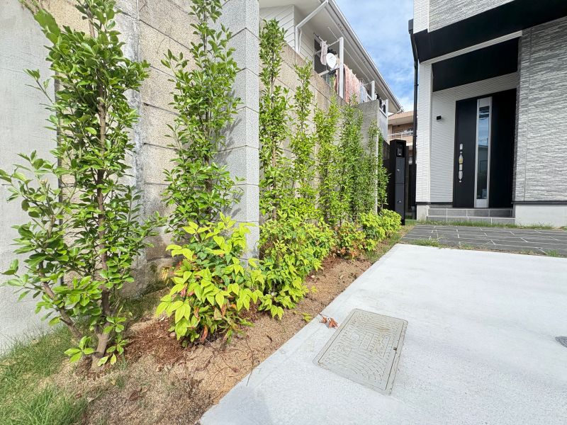 玄関までストレートに伸びるアプローチには植樹された緑が柔らかく家族をエスコートします。毎日ホッとした瞬間になりそうです。敷地は車2台分のスペースがありますから、2台ではなくても自転車もゆったり置けたり、プールを置いて庭で遊んだり。素敵な家が見つかりました。