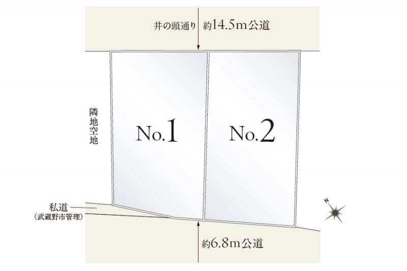 | 接道状況 | 南西側約6.8m公道(一部私道)、北東側約14.5m公道 |