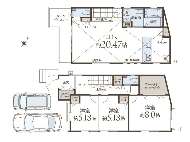 3LDK+WIC+SIC+小屋裏収納+カースペース2台