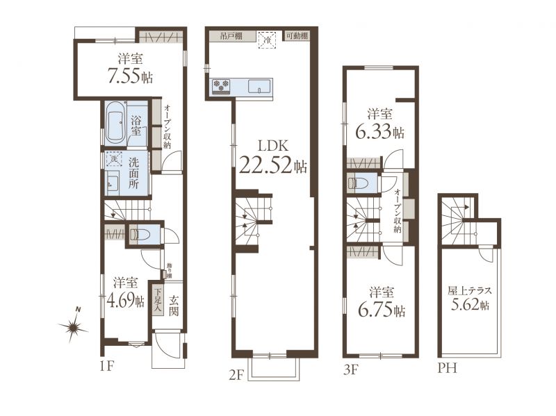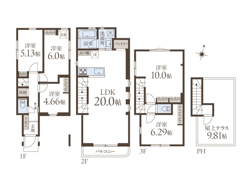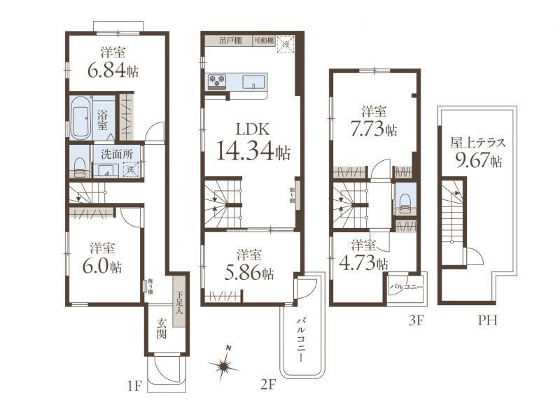 | 間取り | 4LDK+屋上テラス+カースペース1台~5LDK+屋上テラス |