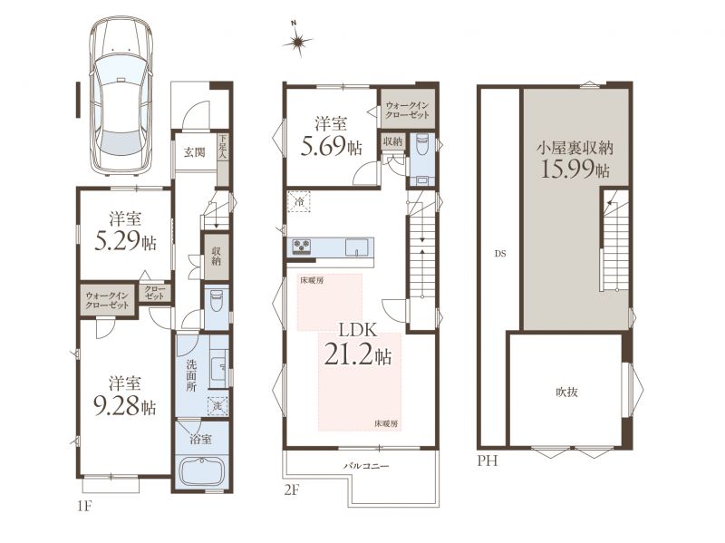 3LDK+WIC+小屋裏収納+カースペース1台