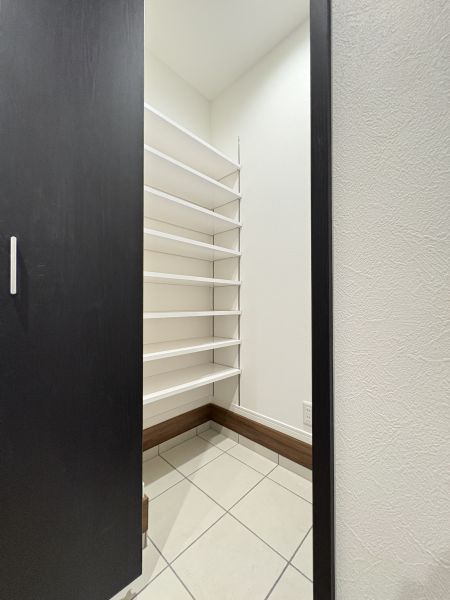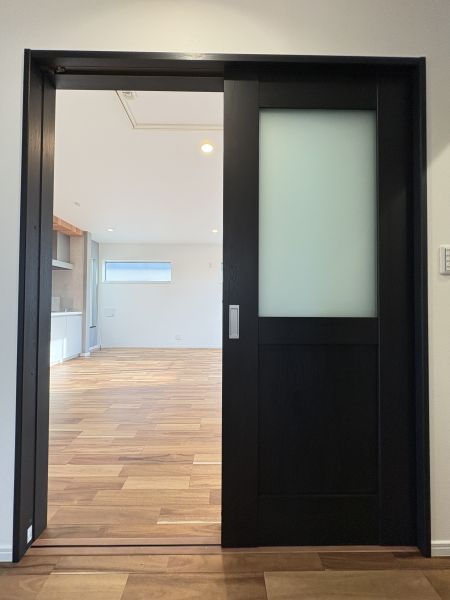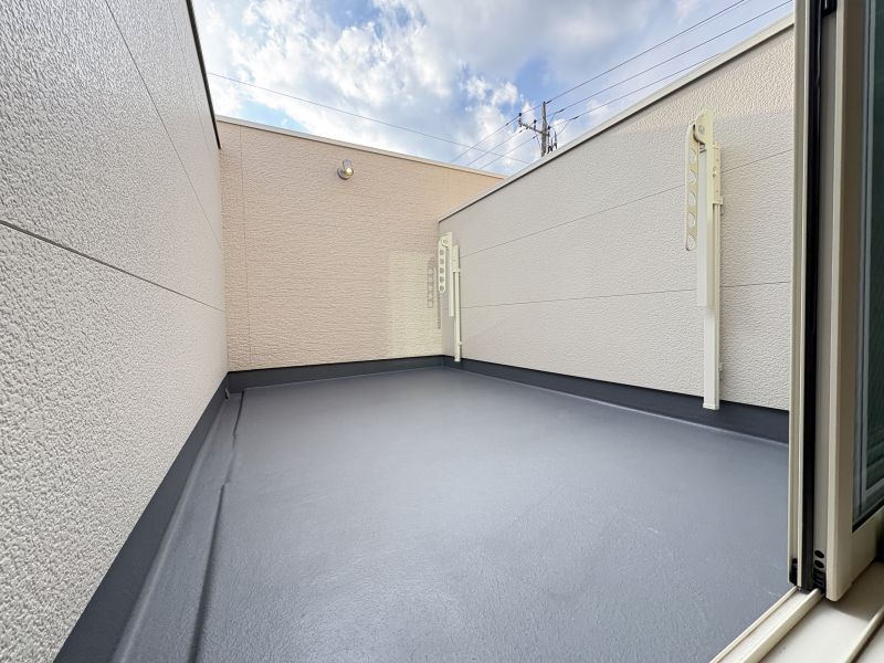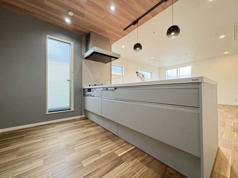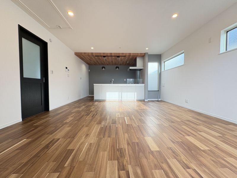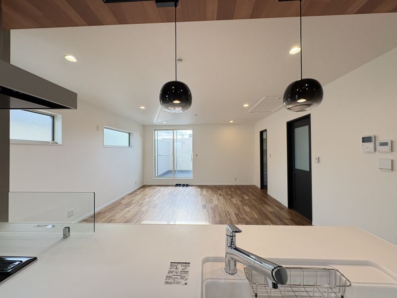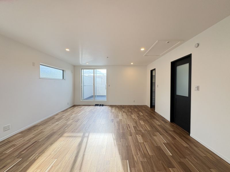 アクセントが散りばめられ、シャレたキッチンが印象的です。外から外観を見る限りは白基調で爽やかさのある印象ですが、室内へ一歩入ると、床色の重厚感や設備のハイグレード感、建具の色使いなど、アンティークな街角カフェに訪れたかのような気持ちになります。リビングは2階です。長方形のLDKはレイアウトの自由さあり。キッチンはカウンター型。リビングからアプローチできる大きなバルコニーにはテーブルセットを置いてみたい空間です。完成しておりますので実際の建物をご覧いただけます。