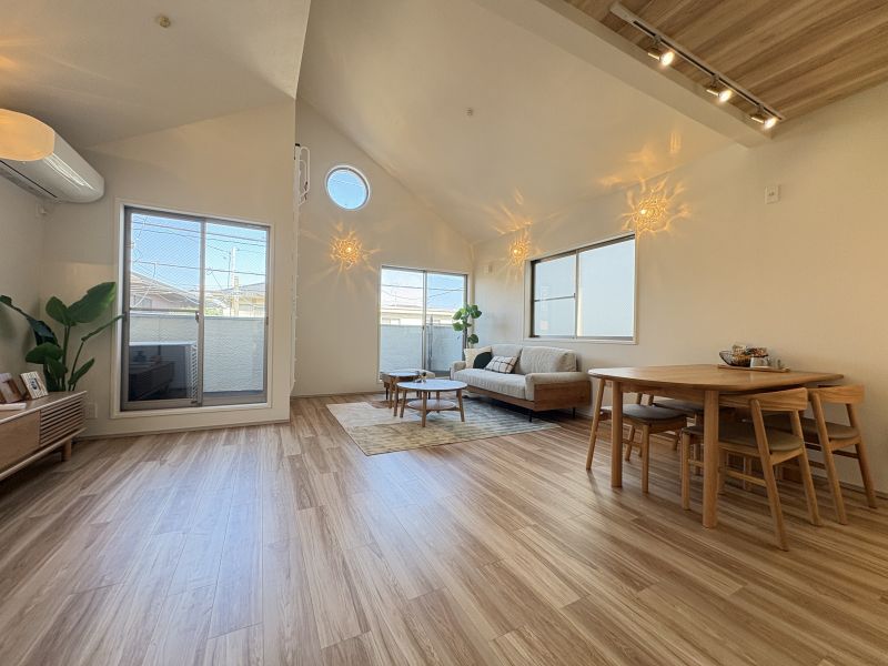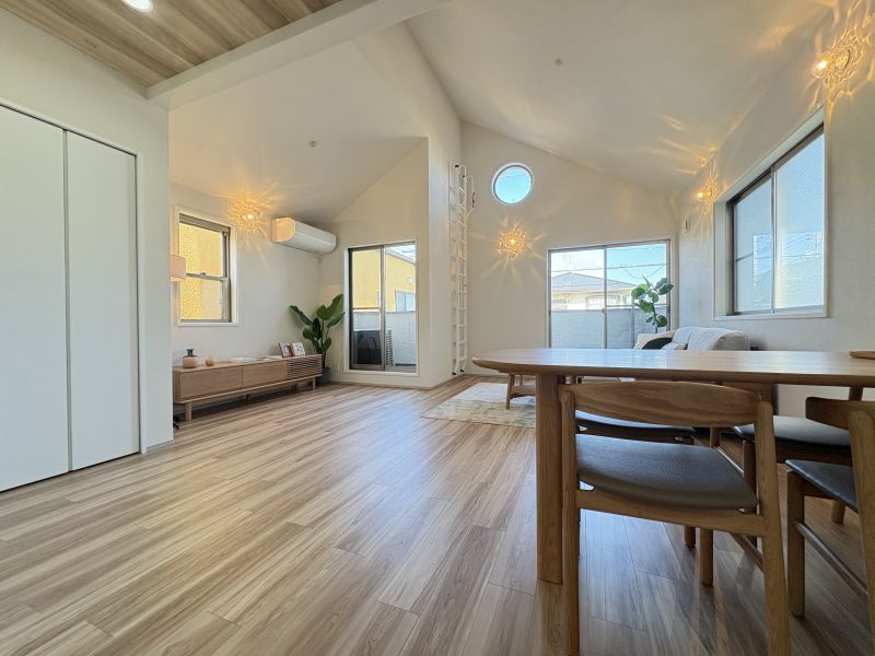 室内フルリフォームを入れた建物。個性ある外観はオシャレなままに活かしています。場所は杉並区南荻窪、地域の方々から神明さまと呼ばれる神明天祖神社があるエリアです。邸宅が多く、家々の庭木の存在が街全体を柔らかく彩っています。さて、話を戻し室内に入ると、寸法の取り方などこだわりの建築になっていることを感じます。ワイドなゆとりを持った玄関ホール、床は石です。寝室を3つ備えた1階フロアにバスルームも配置。2階を開放的な明るいリビングにしています。夜の照明で外観に輝くまん丸お月様はここにありますよ。暮らしのイメージは、6人掛けくらいの大きめなダイニングテーブル、L字型の大きなソファーが似合いそう。キッチンとのアプローチは大きな開口にしていますので、一体感があります。学区は荻窪小学校、お子様を持つご家庭にぜひご覧いただきたい南荻窪のリフォーム完成戸建でございます。